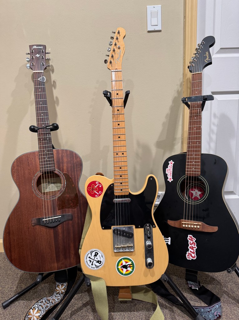 Not that I have a huge collection. I have exactly three: an Ibanez Art Wood acoustic, a Fender Telecaster, and a Fender Joe Strummer edition Campfire acoustic.